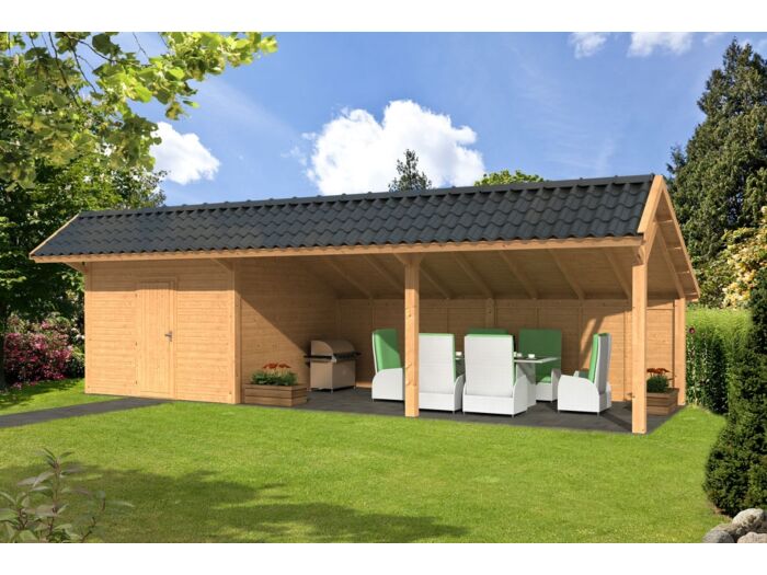 Kapschuur Bergen XL type 7 van B989xD452 cm wordt vervaardigd uit hoge kwaliteit gedroogd en geschaafd lariks douglas hout. Deze kapschuur heeft een hoogte van 326 cm. Dit type wordt geleverd inclusief wanden.